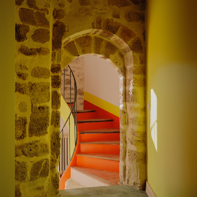 L'ancien corps de ferme et sa tour de garde du XIIe siècle évoquent un monastère des temps modernes traversé par la couleur. Une retraite pop et bucolique, où l'architecte et designer invite à une odyssée immersive, entre patrimoine et modernité.