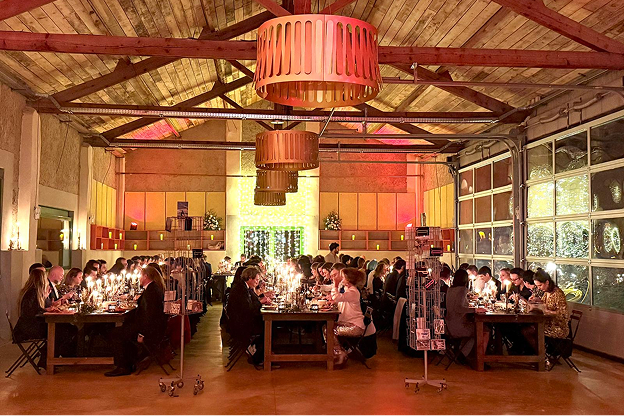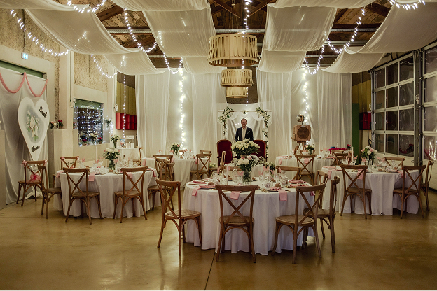 Une salle de réception de 300m2, comprenant une cuisine professionnelle, peut accueillir jusqu'à 150 personnes (assises).